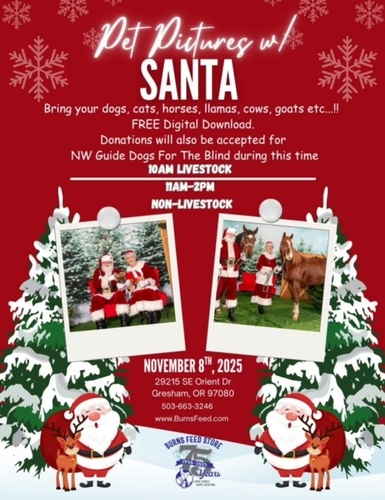 Coming soon to the Burns Feed Store events lineup: Pet Pictures with Santa & Mrs. Claus! Check out the festive timetable: at 10:00 a.m. it's a barnyard bonanza with livestock only, then at 11:00 a.m, all the furry, scaly, and feathery friends are invited to join the fun. We can't wait to see all your adorable critter!