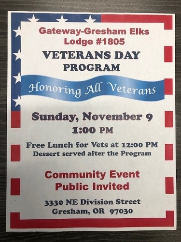 Gateway-Gresham Elks Lodge #1805 Veterans Day Program. Honoring all Veterans Sunday, November 9th 1:00pm. Free lunch for Vets at 12:00pm. Dessert served after the program. Community event public is invited
