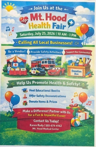 Join us at the Mt. Hood Health Fair Saturday, July 25, 2026, from 10:00 am - 1:00 pm.